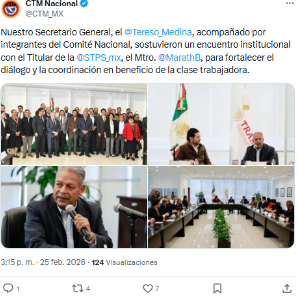 Ciudad de México, 24 de febrero de 2026. -En el arranque de la nueva dirigencia de la Confederación de Trabajadores de México (CTM), su secretario general, Tereso Medina Ramírez, sostuvo un encuentro institucional con el titular de la Secretaría del Trabajo y Previsión Social (STPS), Marath Baruch Bolaños López, con el objetivo de consolidar la coordinación entre el movimiento obrero y el Gobierno federal en favor de las y los trabajadores.